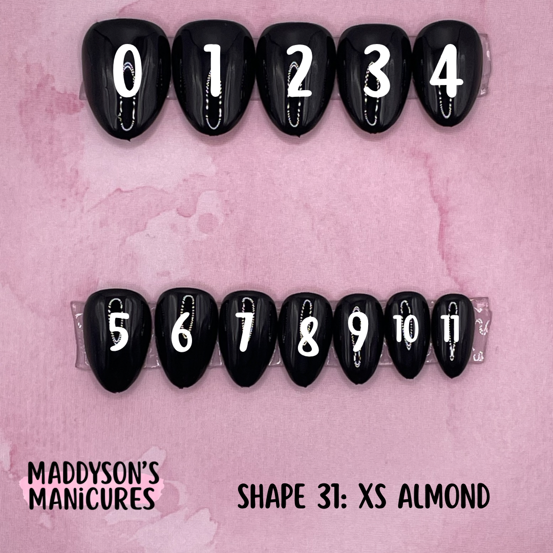 Pairs of Sizes 0-11Size 0: Width 18mm / Length 21.5mmSize 1: Width 17mm / Length 21mmSize 2: Width 16mm / Length 20.5mmSize 3: Width 15mm / Length 20mmSize 4: Width 14.5mm / Length 19.5mmSize 5: Width 14mm / Length 19mmSize 6: Width 13mm / Length 18.5mmSize 7: Width 12.5mm / Length 18mmSize 8: Width 12mm / Length 17.5mmSize 9: Width 11mm / Length 17mmSize 10: Width 10mm / Length 16.5mmSize 11: Width 9mm / Length 16mm
