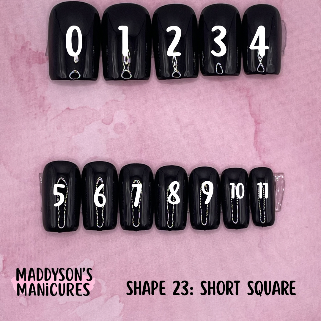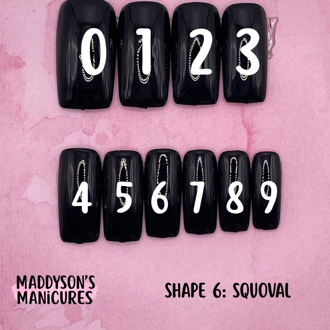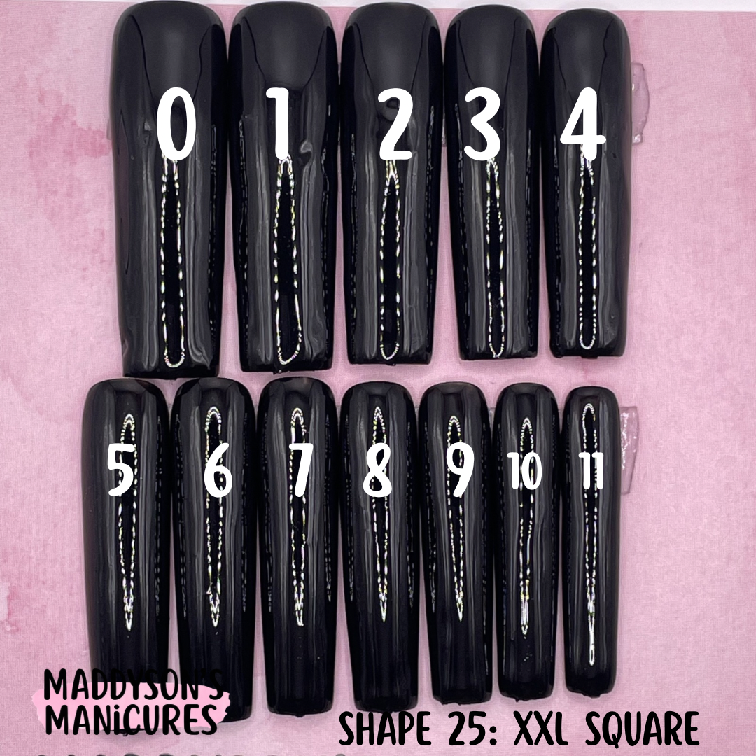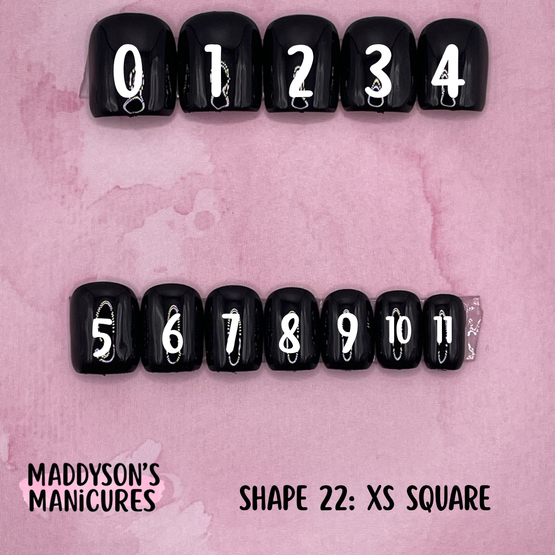 Pairs of Sizes 0-11Size 0: Width 18mm / Length 25.5mmSize 1: Width 17mm / Length 25mmSize 2: Width 16mm / Length 24mmSize 3: Width 15mm / Length 23.5mmSize 4: Width 14.5mm / Length 23mmSize 5: Width 14mm / Length 22.5mmSize 6: Width 13mm / Length 22.5mmSize 7: Width 12.5mm / Length 22mmSize 8: Width 12mm / Length 22mmSize 9: Width 11mm / Length 21mmSize 10: Width 10mm / Length 20mmSize 11: Width 9mm / Length 20mm